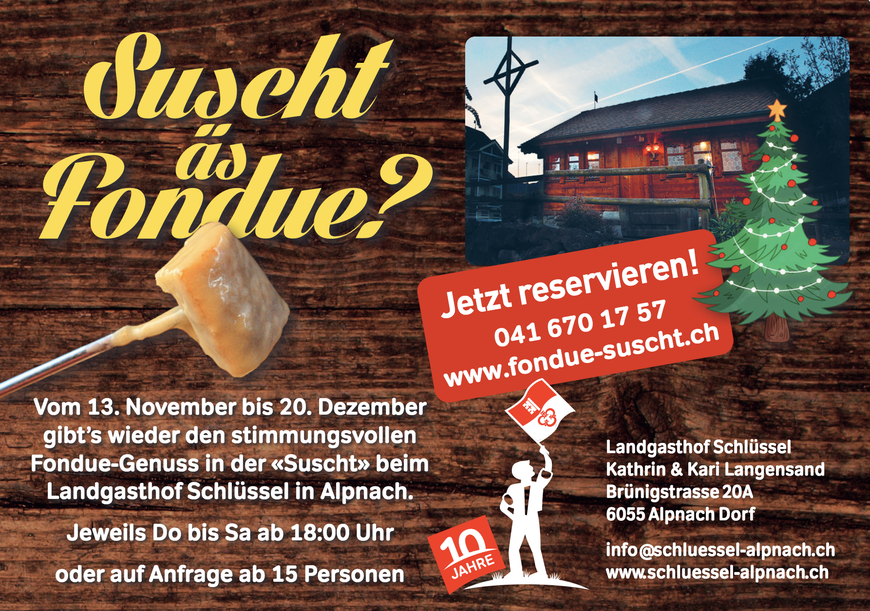 Unsere Fondue-Saison dauert jeweils von Mitte November bis Weihnachten. Für Gruppen ab 15 bis 50 Personen öffnen wir die Fondue-Suscht für Sie exklusiv und Sie geniessen die einmalige Chalet-Atmosphäre mitten im Dorf. Reservationen via info@schluessel-alpnach.ch oder 041 670 17 57.
