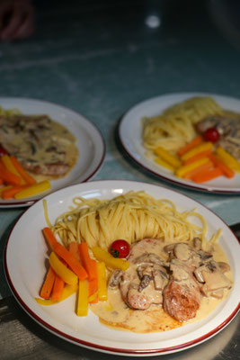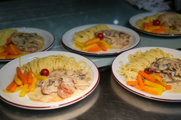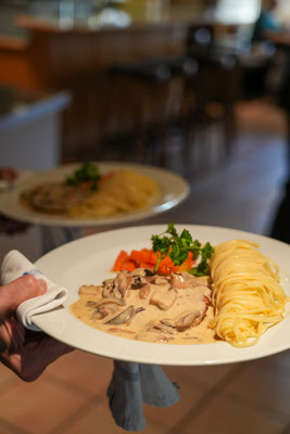 Schweinsschnitzel mit Pilzrahmsauce, Butternudeln & zweifarbige Rüebli nach Grossmutters-Art