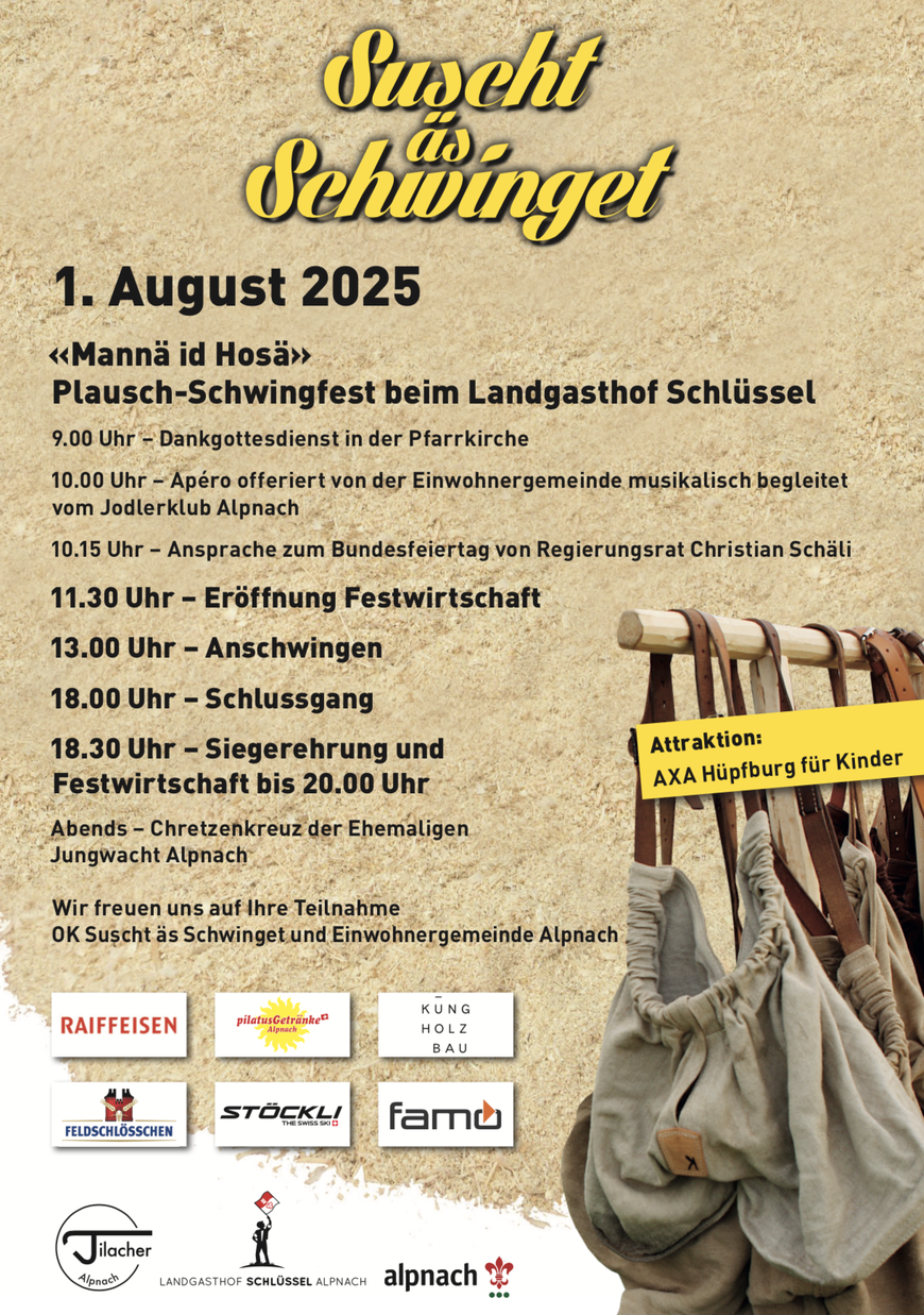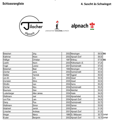 Mit Betschart Jörg aus Menzigen als Sieger über den Brittnauer Häfliger Christian endete abends ein würdiger Schlussgang als Höhepunkt vom 4. Suscht äs Schwinget. Als dritter Kranzgewinner und mit der Auszeichnung als "Stärkster Obwaldner" durfte Kathriner Niven den Festplatz hinter dem Landgasthof Schlüssel verlassen. Für eine festliche Atmosphäre vom Volksapéro bis zum Schlussgang sorgten die Alphornbläser und Fahnenschwinger sowie der Jodlerklub Alpnach. Ihnen, den vielen Herfern und Schwingern, allen Supportern sowie dem zahlreichen Publikum aus Nah und Fern gilt an dieser Stelle ein herzliches Dankeschön vom OK Suscht äs Schwinget 2025.